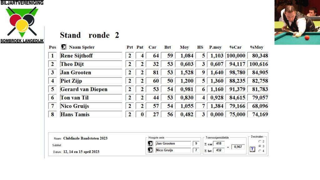 In de laatste 4 beurten maakte Rene het verschil en won in 29 beurten, Gerard kwam er 5 tekort.