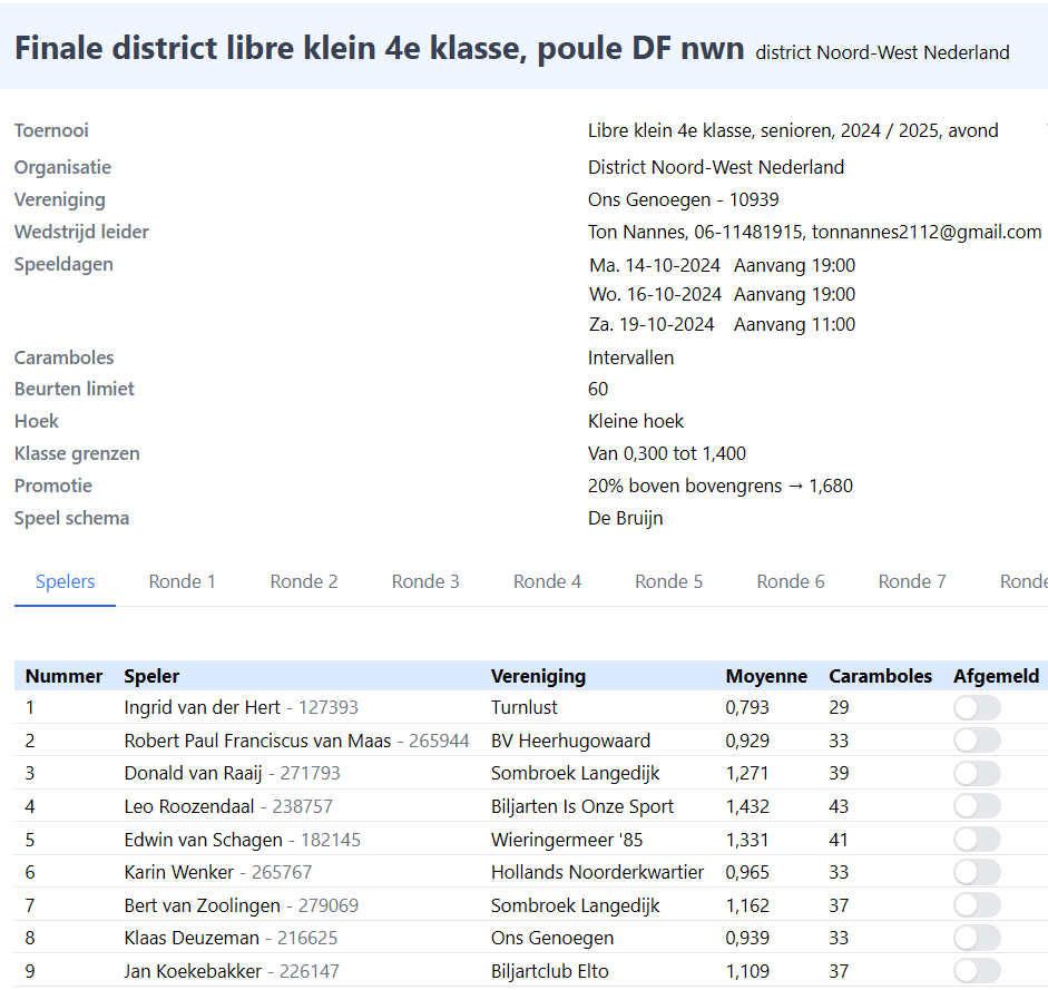 Op 14, 16 en 19 oktober doen Donald van Raaij en Bert van Zoolingen mee aan de districtsfinale 4e klas libre van het district Noord-West-Nederland. De voorrondes hebben ze succesvol afgesloten en zijn nu als 3e en 7e geplaatst. De moyennes verschillen sterk tussen de spelers, dus kan er alles gebeuren en zal het een spannend toernooi worden. Komt allen kijken bij onze 2 toppers bij Biljartvereniging “Ons Genoegen” in het Dorpshuis, Dorpsstraat 126, 1749 AC Warmenhuizen.