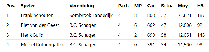 Het eindresultaat is een mooi gemiddelde van 21,6 waarmee Frank mee mag doen met het NK en gepromoveerd is naar de overgangsklasse. Het NK wordt gespeeld in Rumpt op zaterdag 19 en zondag 20 oktober 2024.