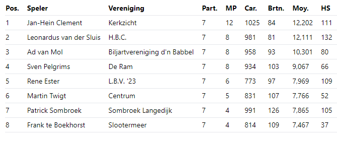 Iets minder fris wakker dan gisteren, maar na een goed ontbijt kan ik er weer tegenaan. Marco geeft vandaag nog wat ondersteuning en rijd vanmiddag mee terug. De eerste partij verloren, maar de 2e partij werd ik aangemoedigd door Marco, Lex Zoon, Frank Schouten en Connie en m’n 2 zoons waren zelfs ook mee. Dit werkte wel, want ik kon die partij met winst afsluiten in 15 beurten. Totaal dus 2 winstpartijen van de 7. Ik had niet zo heel hoge verwachtingen, dus het viel me ook niet zo tegen, maar had graag toch wel een hoger gemiddelde gehad. Ik stroomde in met bijna 11 en eindigde hier met bijna 8. Het is dan toch waarschijnlijk de druk die te hoog ligt waar ik niet zo goed mee om kan gaan, alleen besef je dat zelf niet zo. Je ziet in zo’n laatste partij dat de druk eraf is en dan gaat het ineens goed.