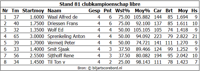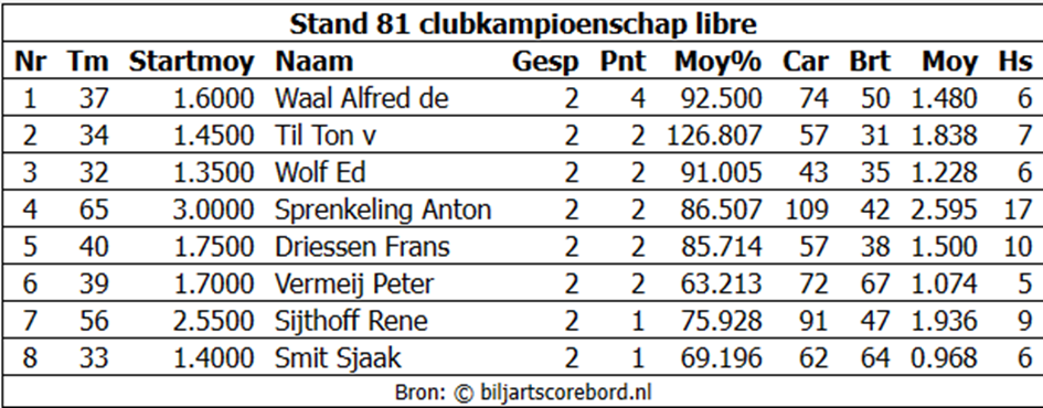 Op tafel 4 speelde koploper Alfred de Waal tegen Sjaak Smit. Alfred begon slecht , was het de druk, uiterlijk was er niets te zien aan hem. Sjaak daarentegen begon goed. Na 10 beurten had Sjaak er 19 gemaakt tegen 2 van Alfred. In beurt 11 herpakte Alfred zich met een serie van 9 terwijl Sjaak minder begon te spelen. In 19 beurten wist Alfred de winst te pakken 37-39