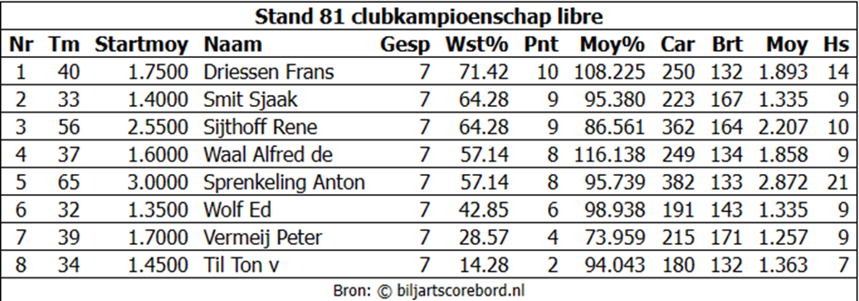 Frans Driessen en Rene Sijthof bonden de strijd op tafel 3 met elkaar aan. Frans begon slecht tegen Rene, die met mooie series een voorsprong opbouwde. Na 19 beurten 38 voor Rene tegen 29 voor Frans. Waar Rene 2 missers noteerde maakte Frans de resterende punten en won.